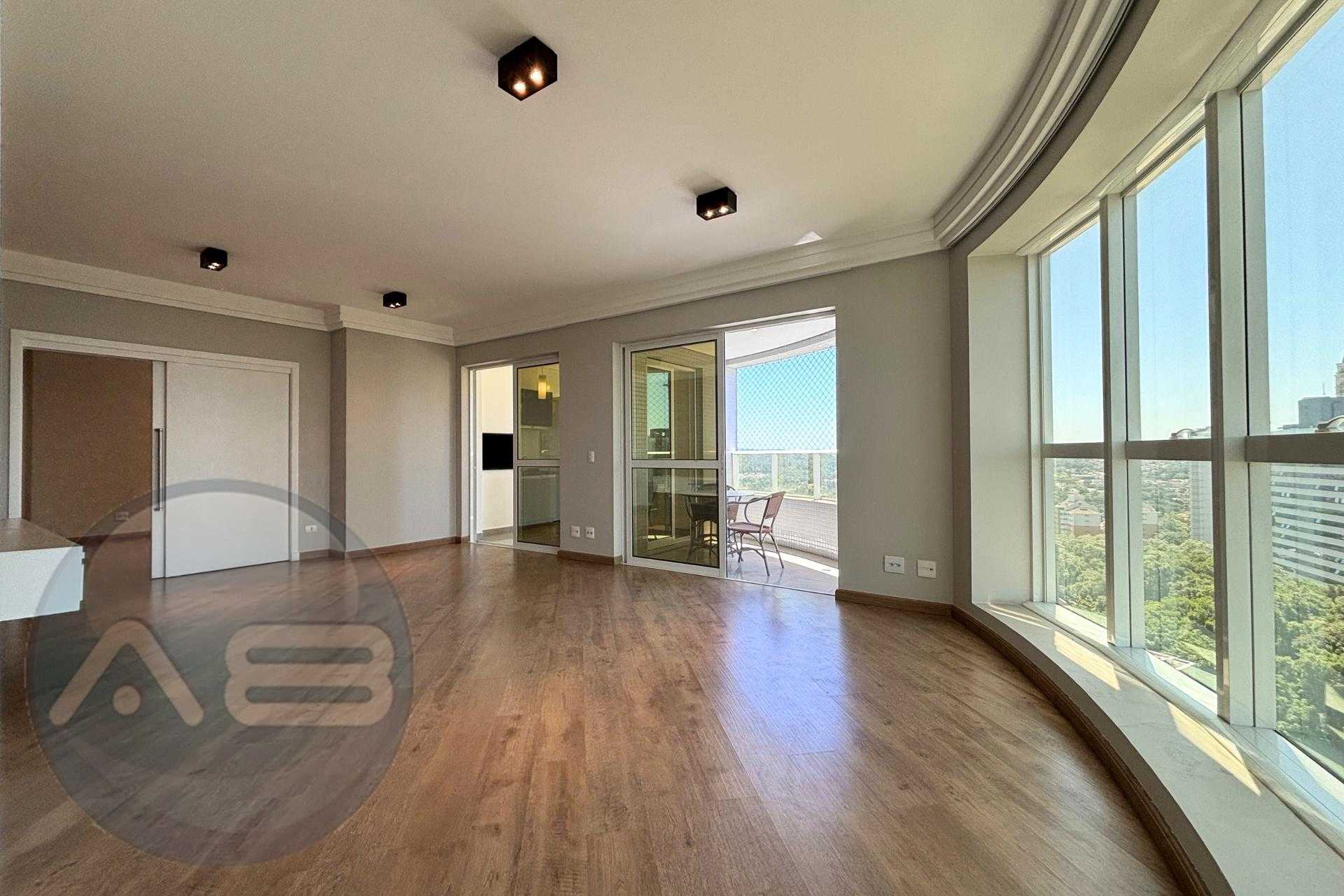 * Ampla sala de estar com rack e esquadrias do teto ao chão, proporcionando excelente iluminação natural e vista para o Ecoville