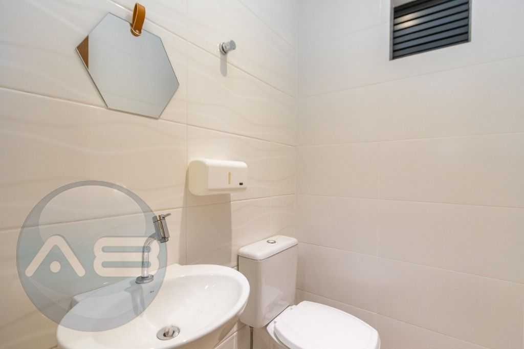 Porcelanato nos banheiros, banheiro do térreo adaptado a portadores de necessidades especiais, todos com bancada em granito;