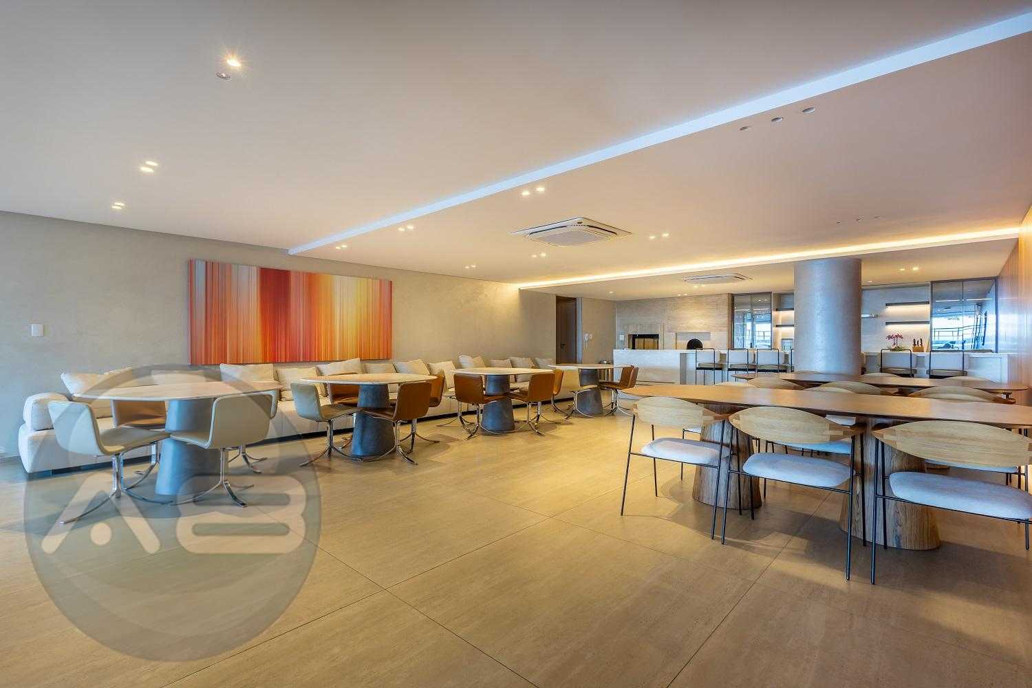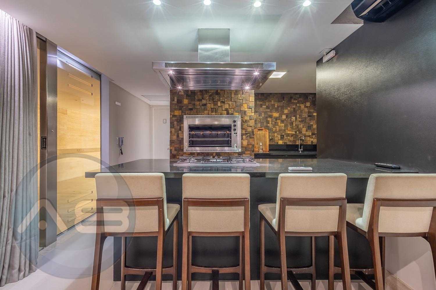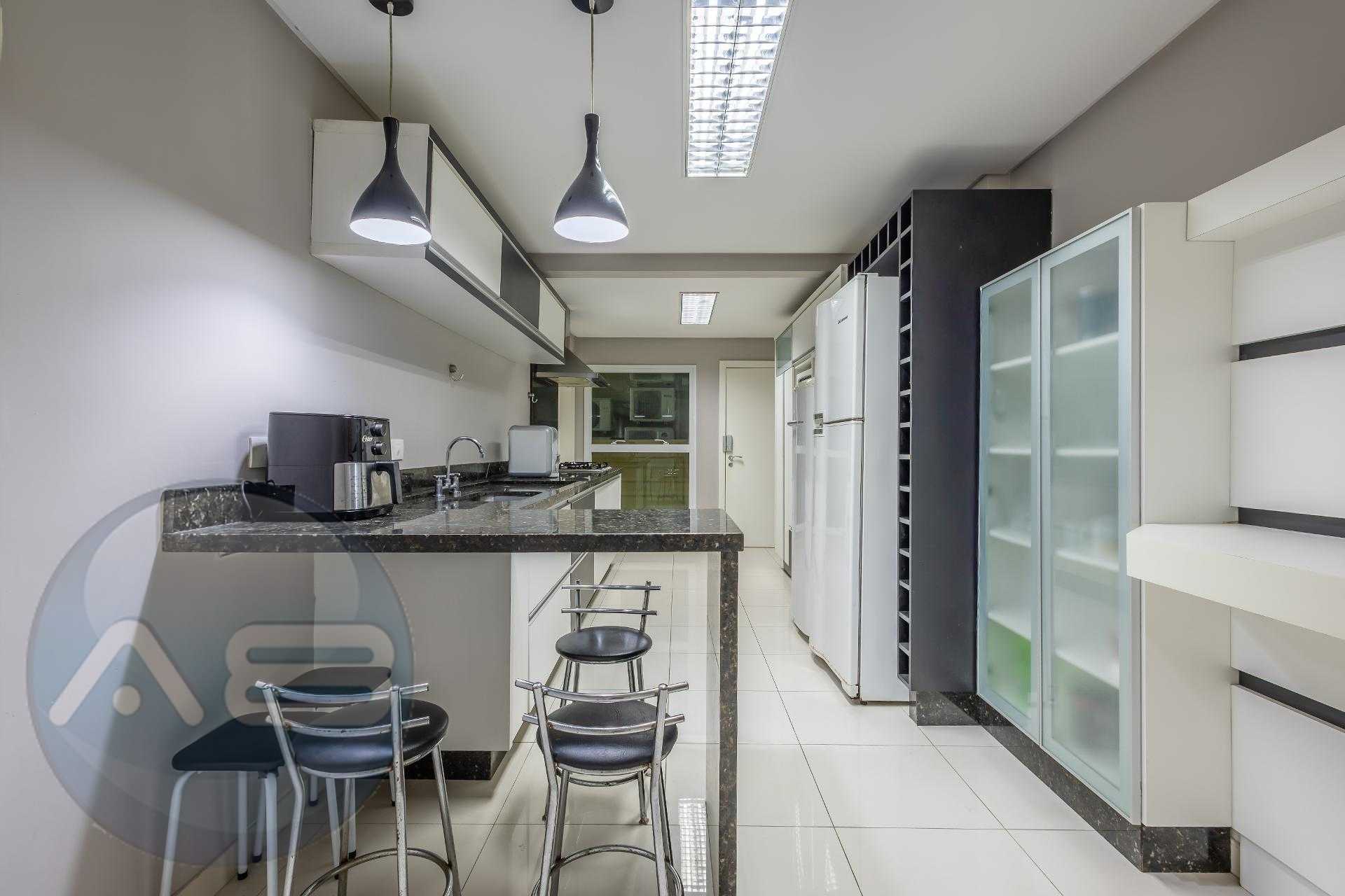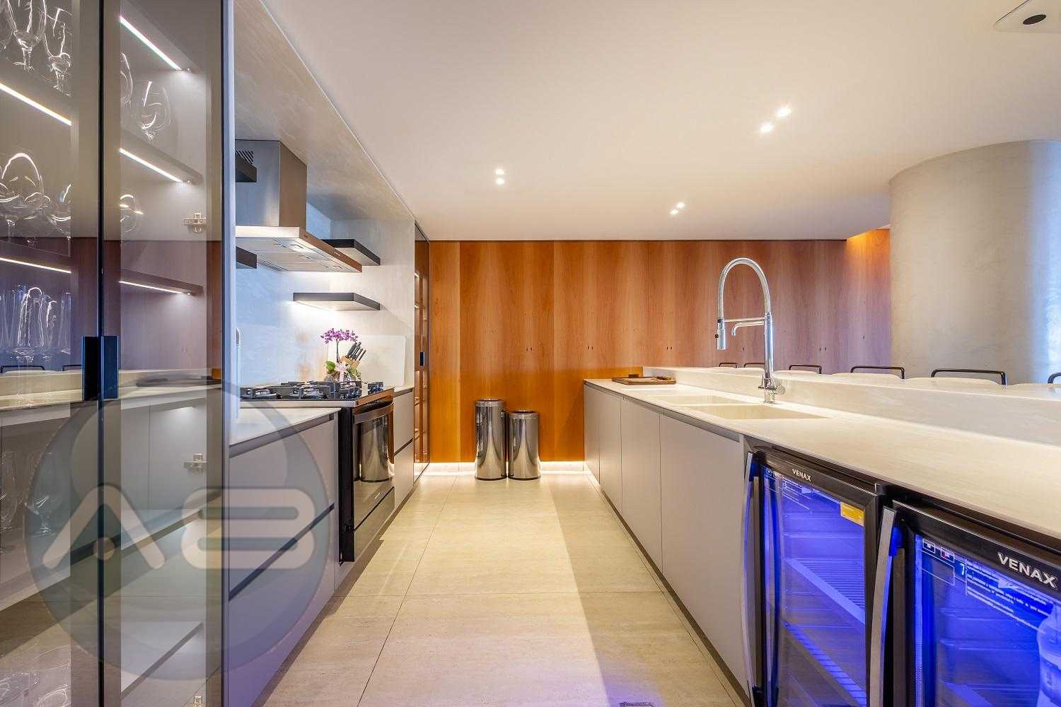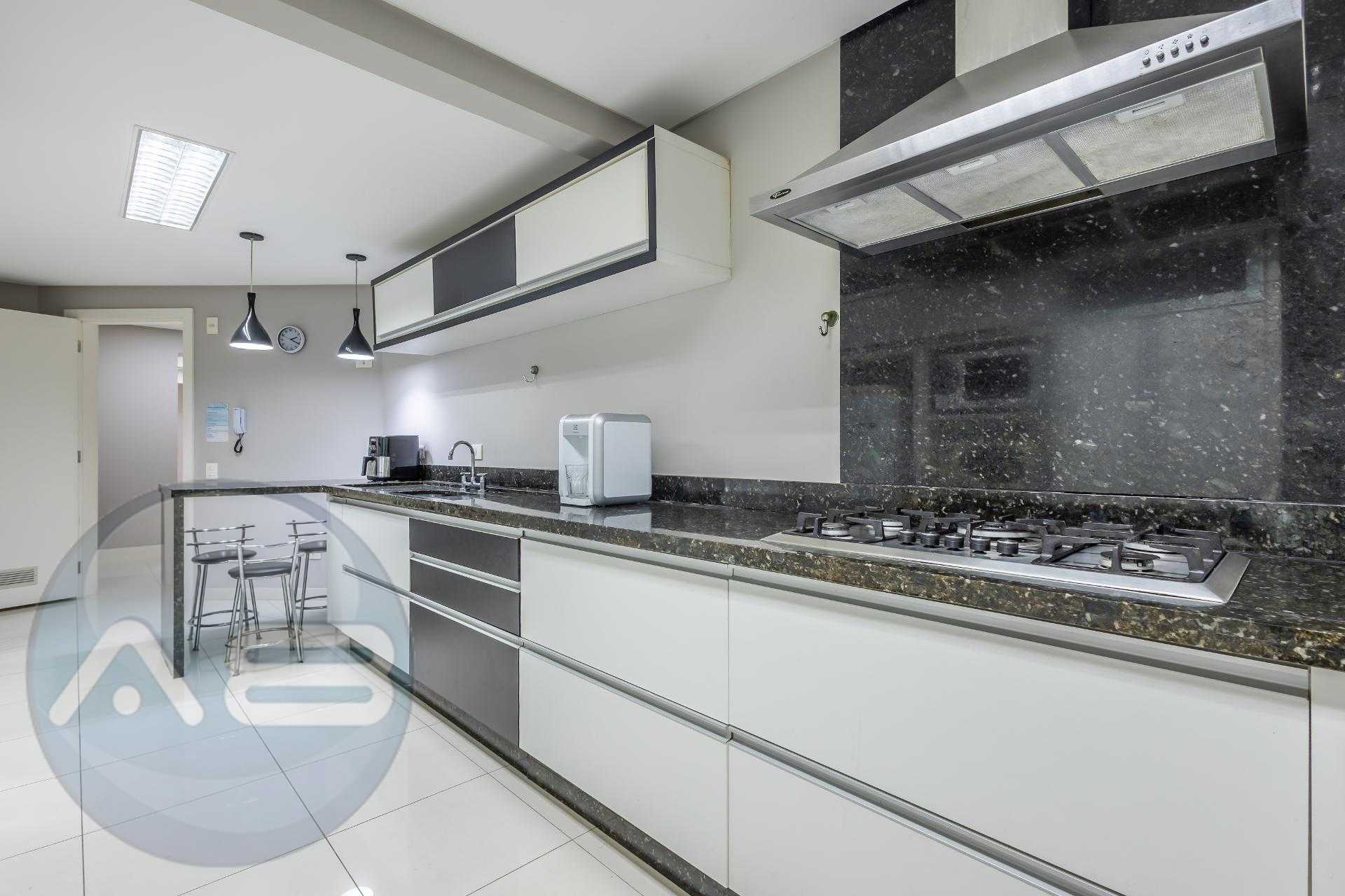Varanda gourmet com churrasqueira a carvão e integrada a área social, proporcionando uma vista definitiva do mar. A cozinha e ampla e conta com espaço para mesa de café e refeições rápidas. Há ainda área de serviço independente e dependência de empregada.