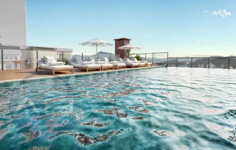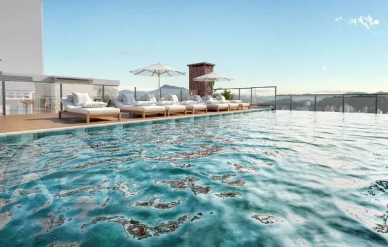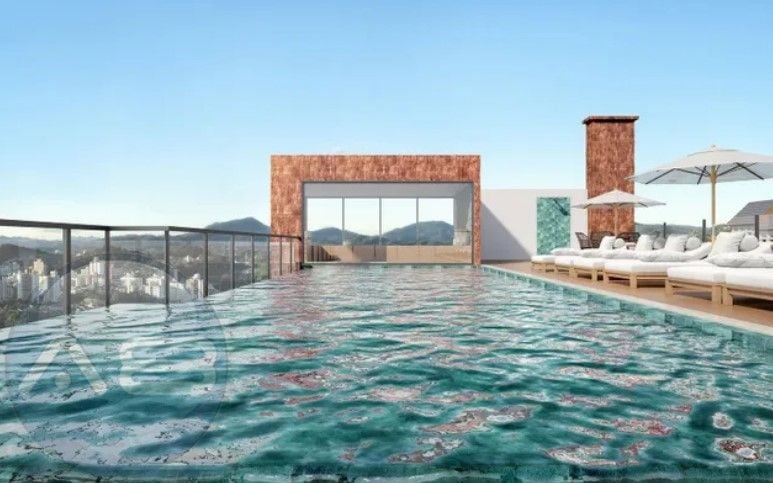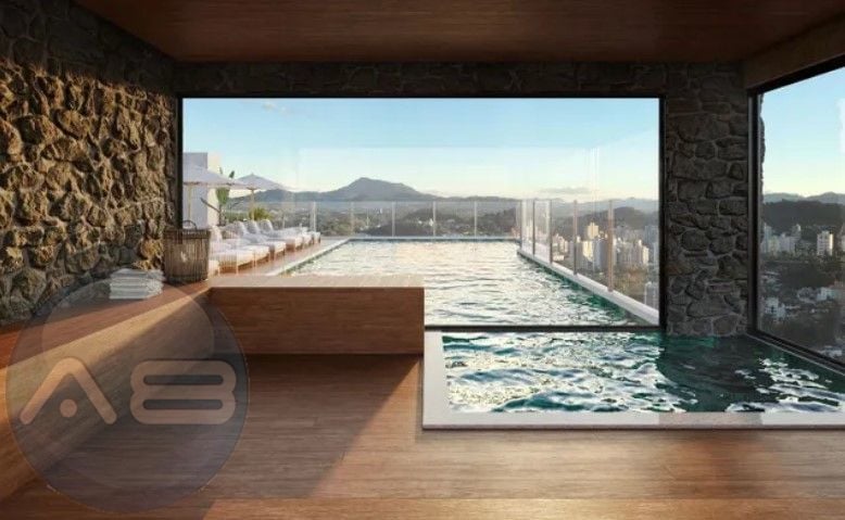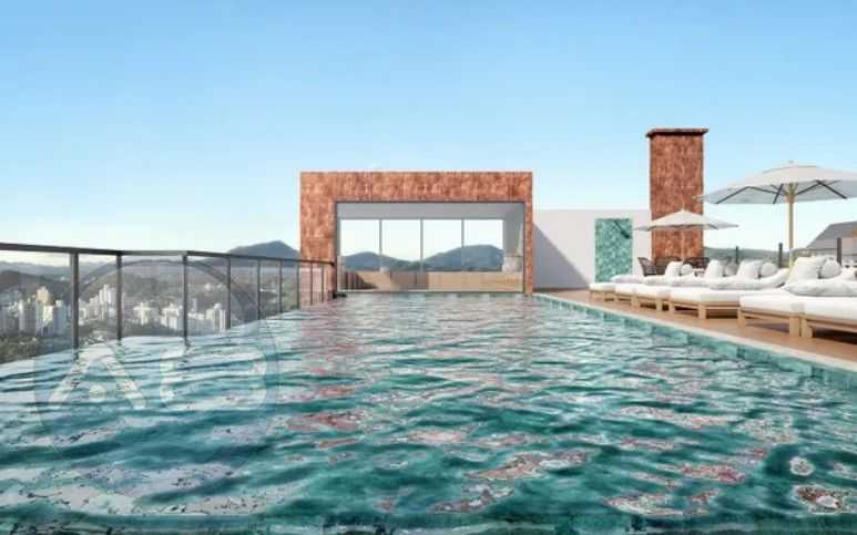 Piscina com borda infinita e sauna, oferecendo momentos de relaxamento e bem-estar.