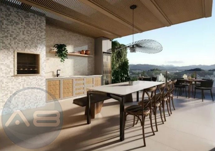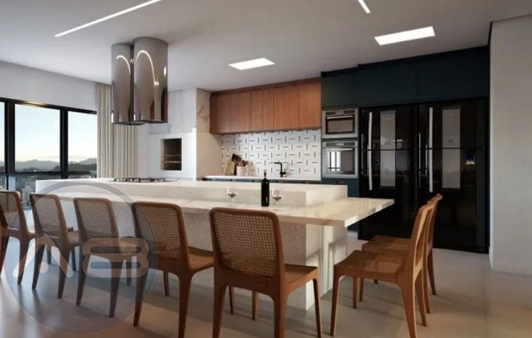 Sala, cozinha e churrasqueira integradas, criando um ambiente perfeito para convivência familiar e receber amigos.