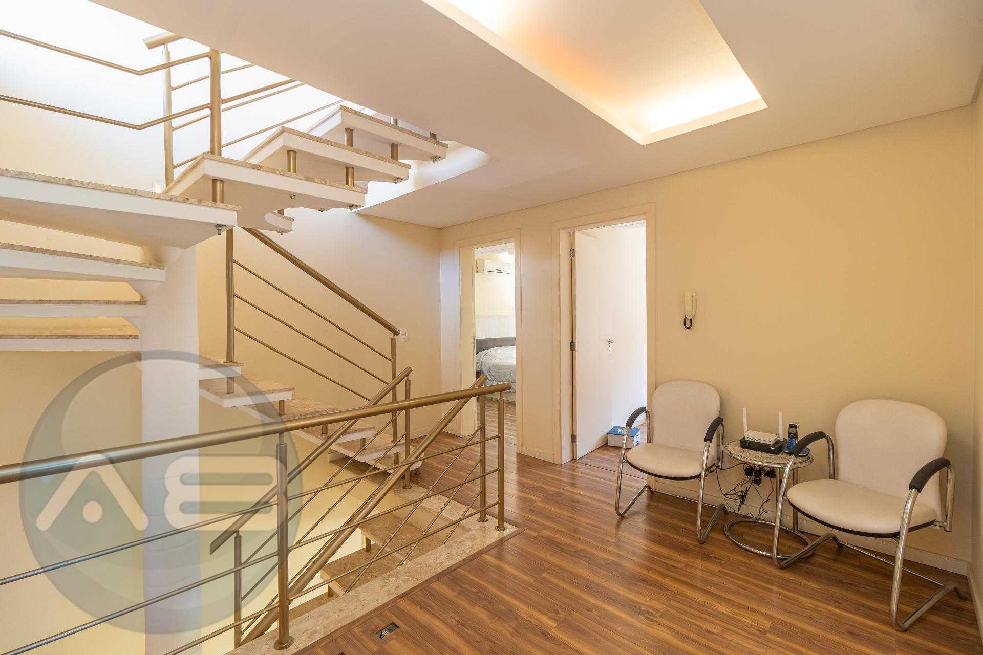 À esquerda, uma escada elegante e bem desenhada conduz aos pavimentos superiores, valorizando o projeto arquitetônico e criando um impacto visual sofisticado logo na entrada.