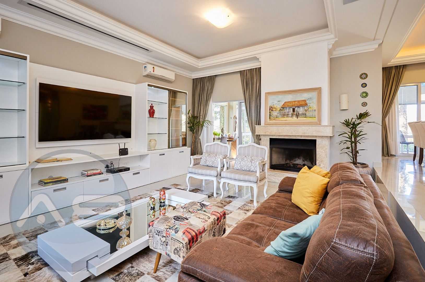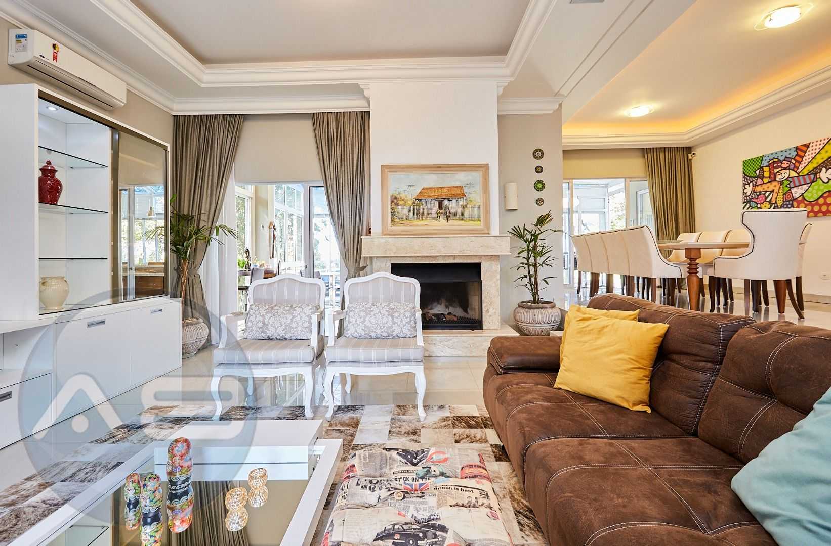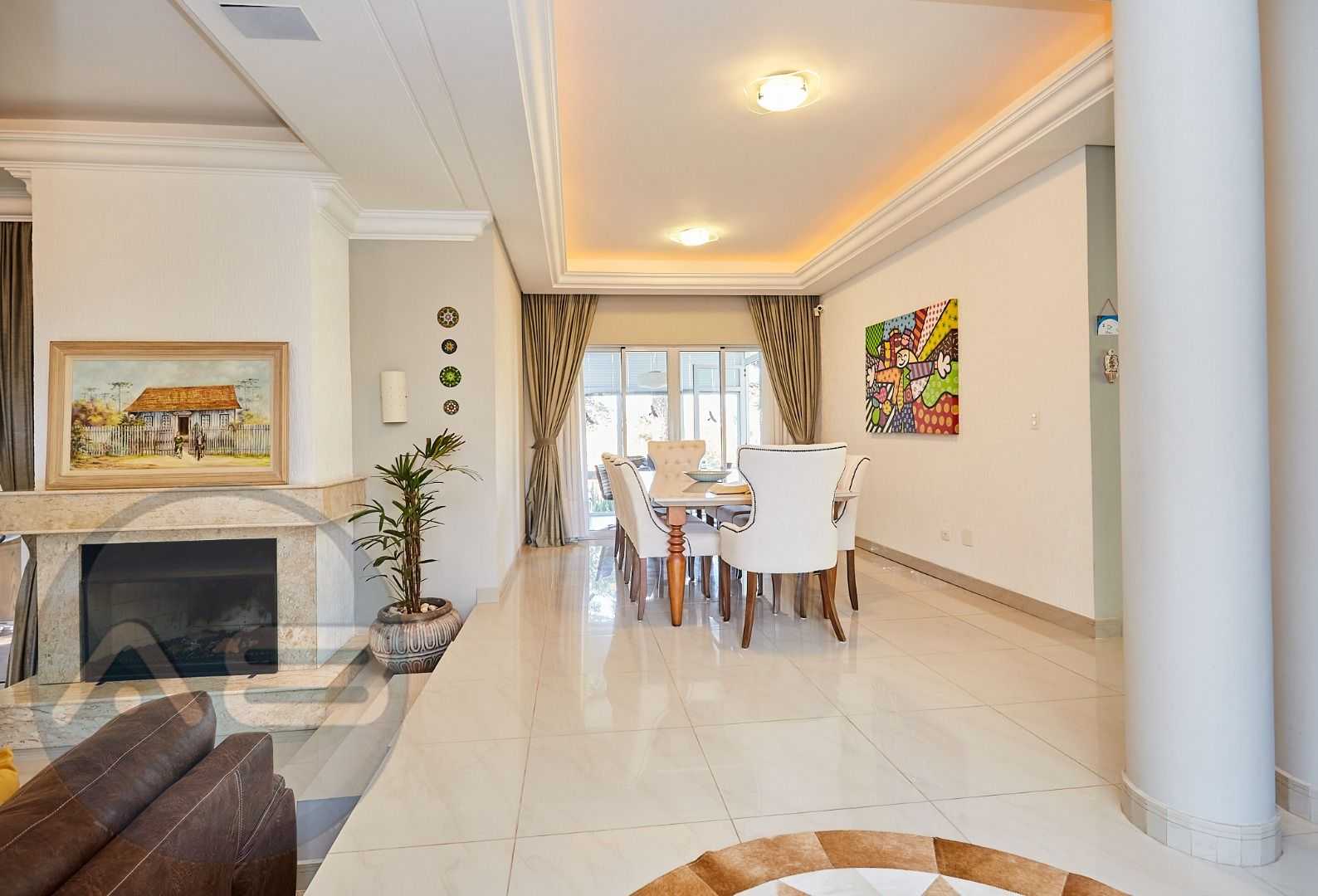 Área social integrada e elegante: salas de estar e jantar com lareira, home theater, lavabo e espaço gourmet conectado ao deck e à cozinha planejada.