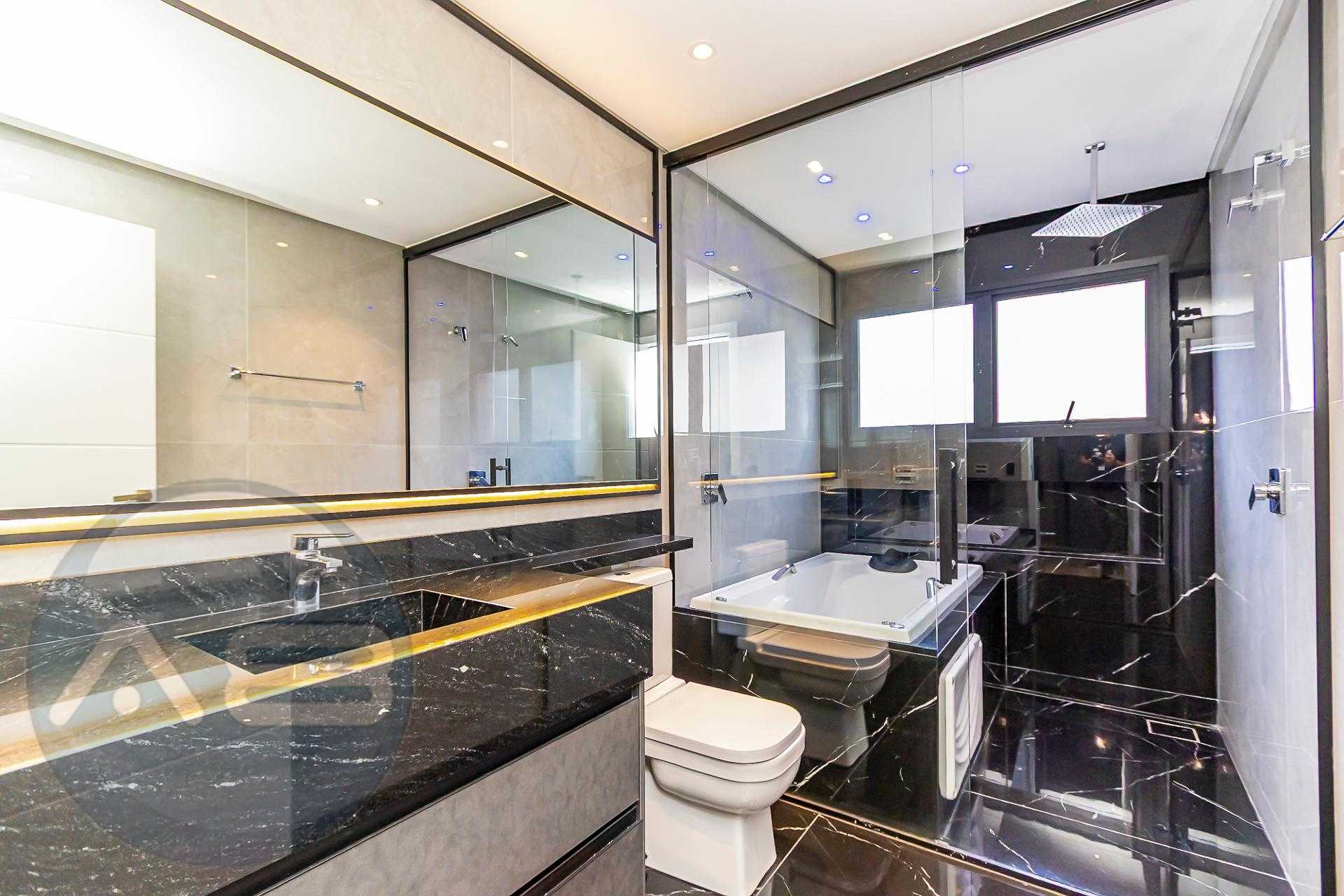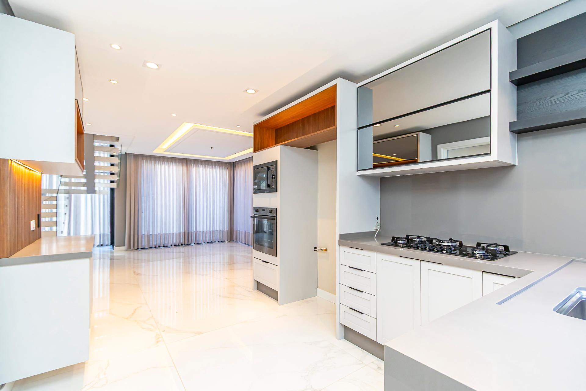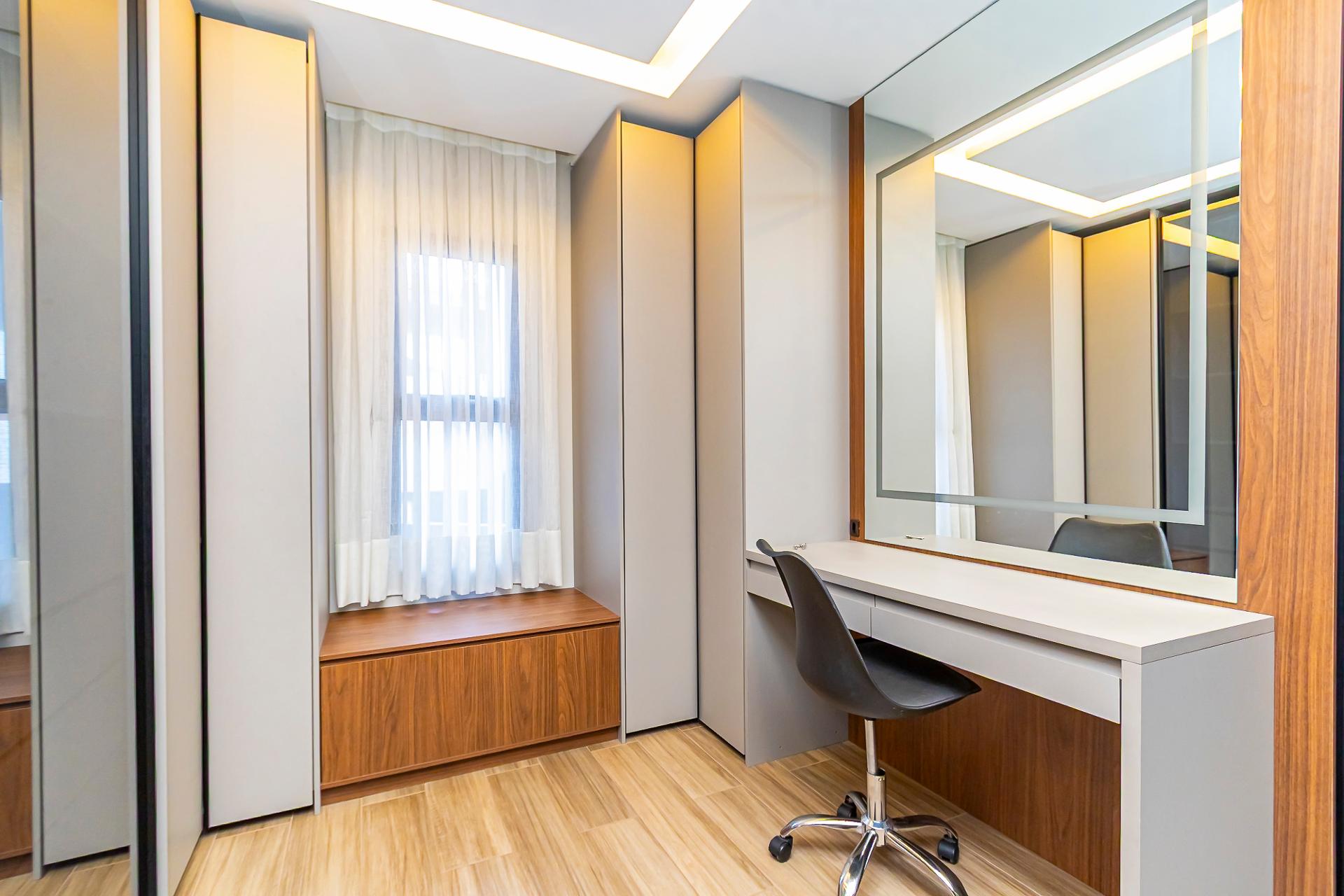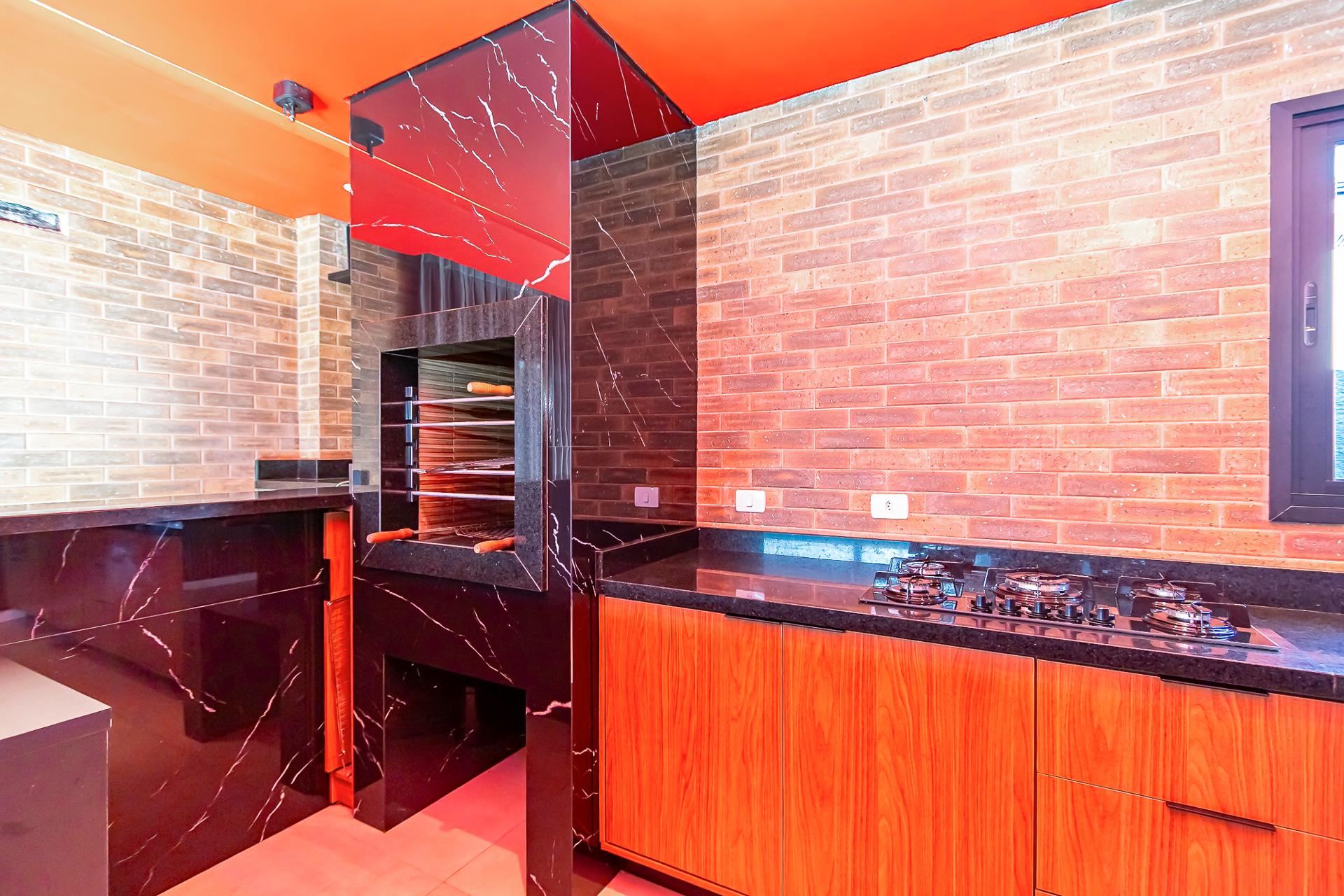 No pavimento térreo, os ambientes sociais se integram de forma elegante: salas de estar e jantar amplas, lavabo e cozinha totalmente planejada, equipada com eletrodomésticos, criando um espaço funcional e acolhedor.