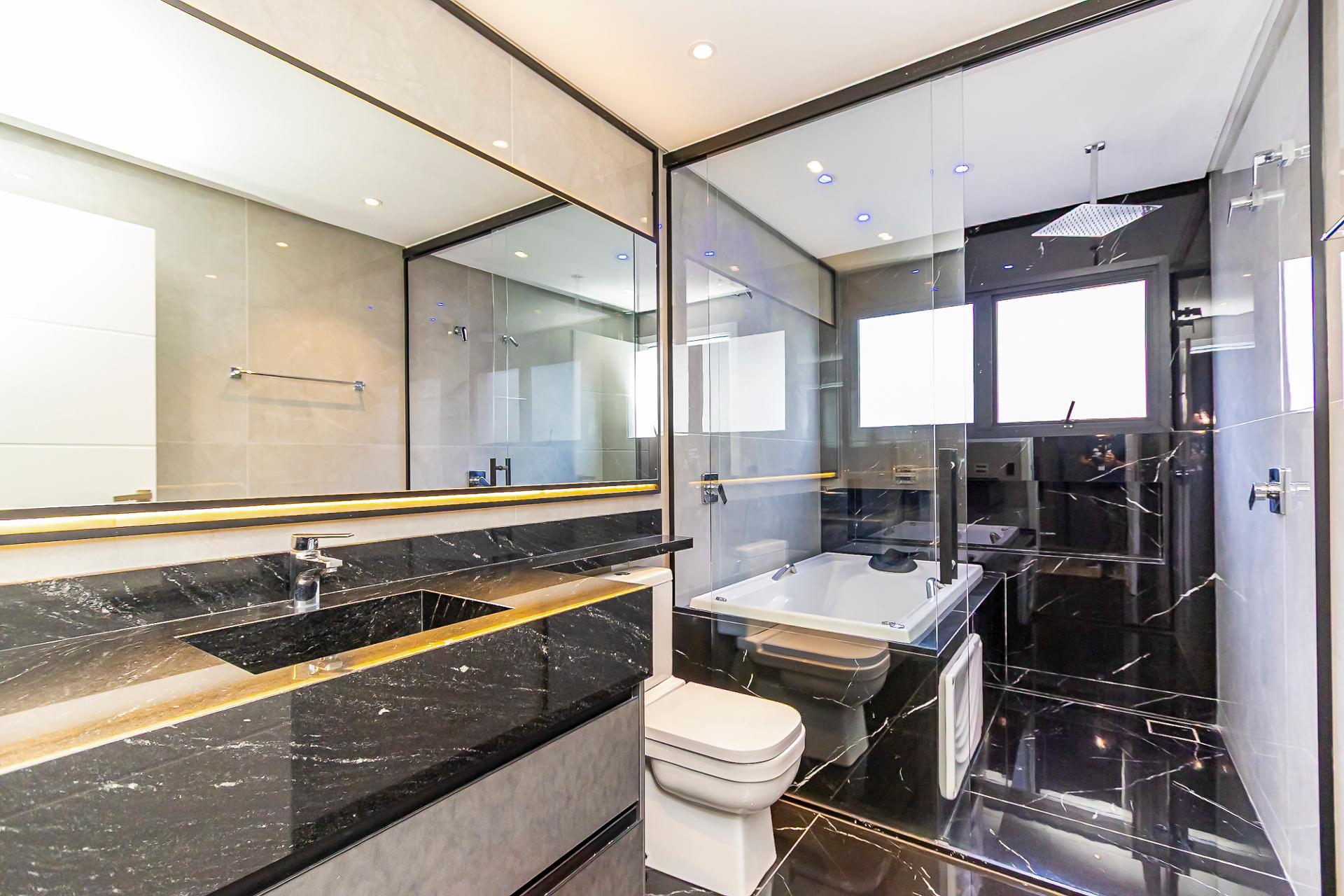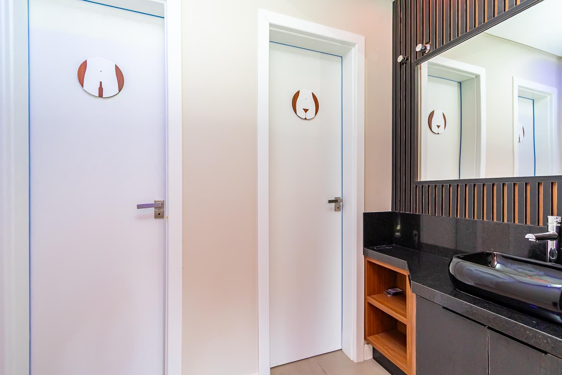 O segundo pavimento concentra lazer e descanso. A área gourmet completa com churrasqueira, banheiros masculino e feminino e acesso direto ao gramado plano com hidromassagem forma o cenário ideal para receber amigos e familiares. Neste andar estão também três suítes mobiliadas, com circulação íntima reservada, incluindo a suíte principal com varanda e vista livre para o golfe.