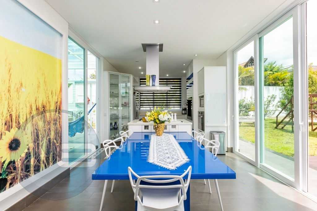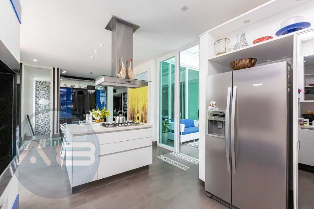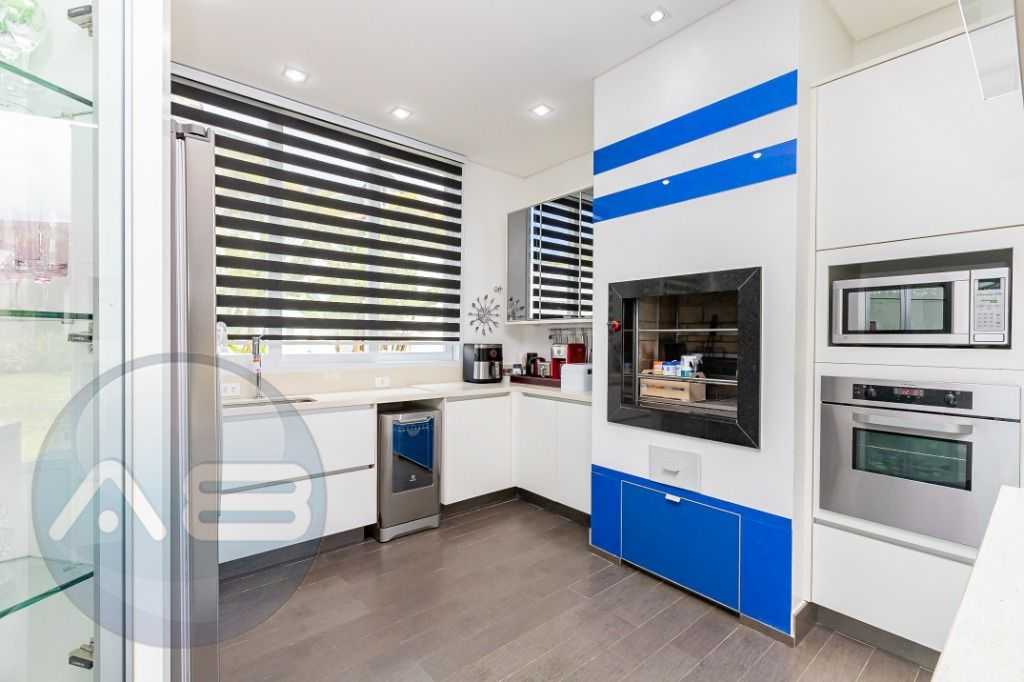 - Cozinha moderna com ilha gourmet, churrasqueira e espaço para copa
