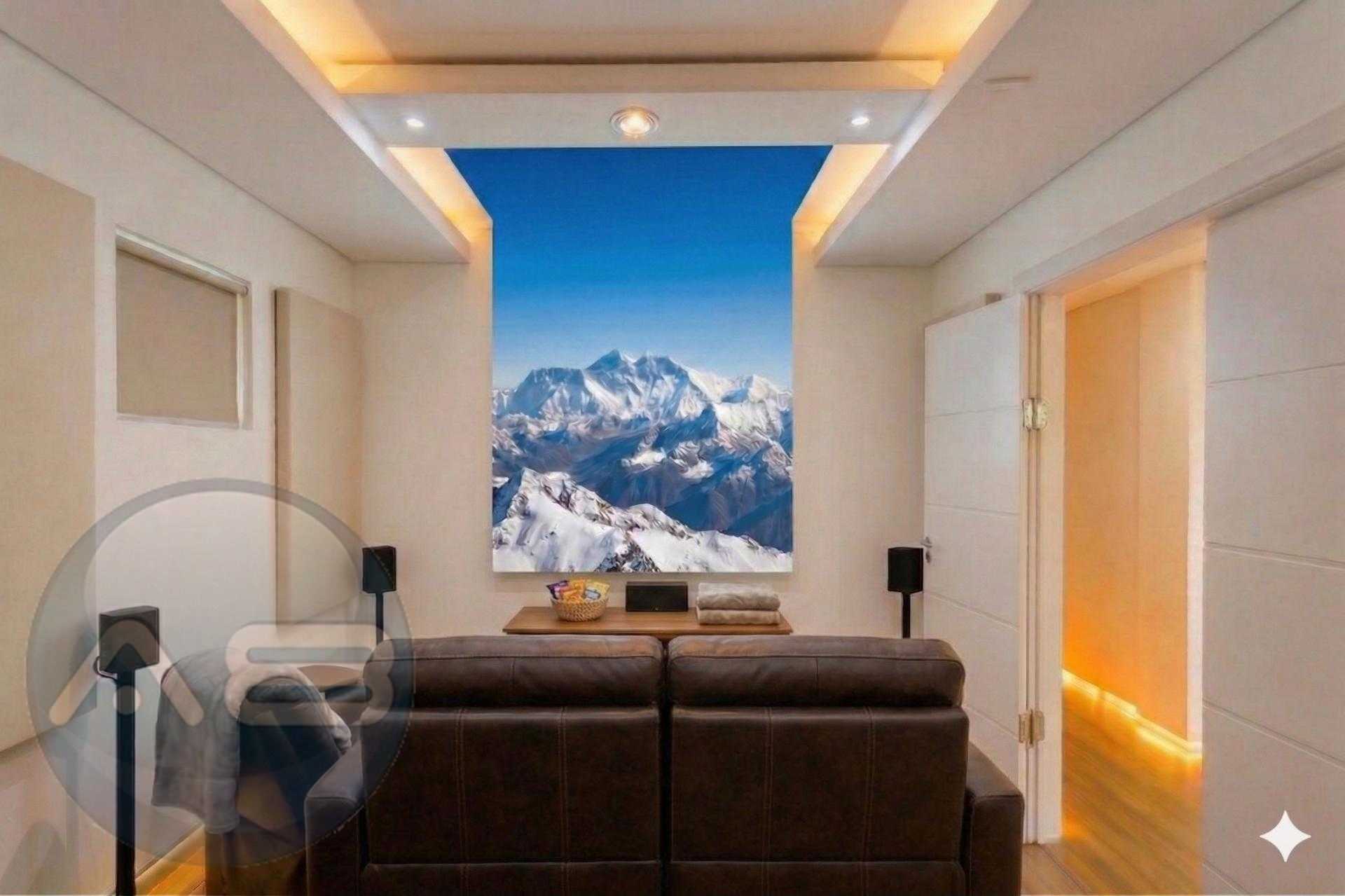 Sala de Cinema com projeto acústico, iluminação, piso elevado e sofá em couro incluso.