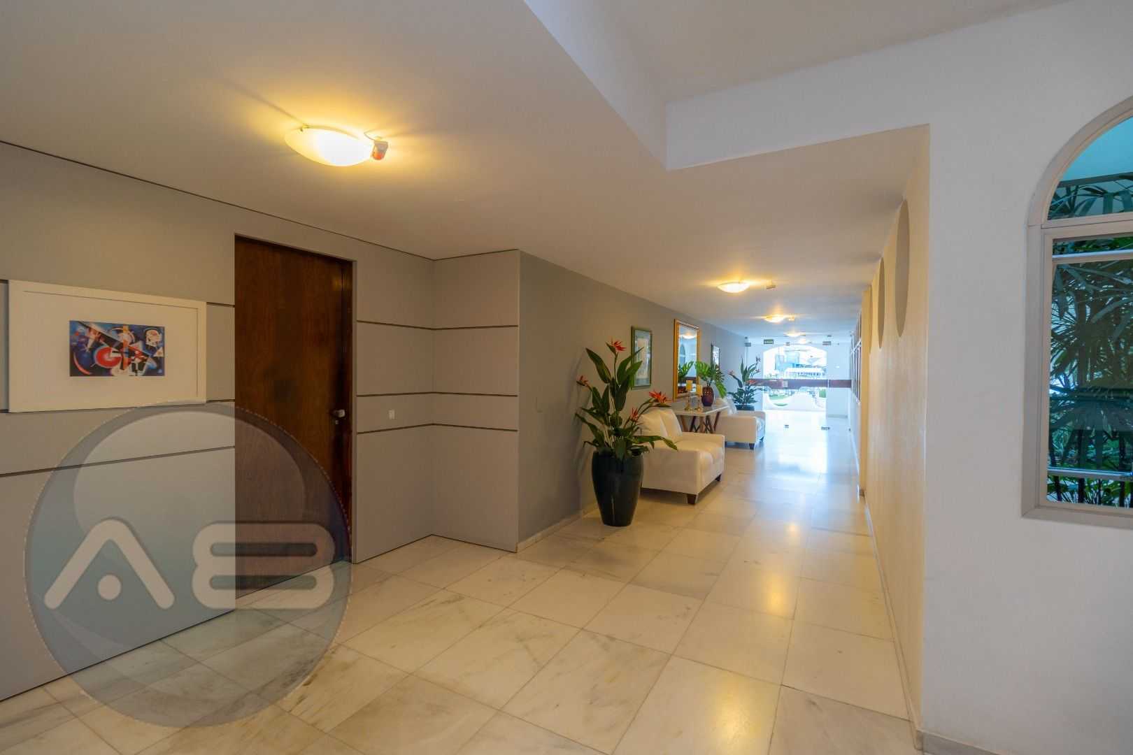 Salão de festas e jardim no piso térreo, com hall de entrada em mármore branco.
