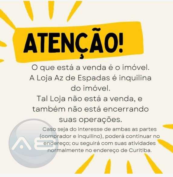 ATENÇÃO: A Loja que funciona ali é apenas inquilina do imóvel. Não é proprietária. Tampouco está encerrando suas atividades. Caso seja do interesse de ambas as partes (comprador e inquilino), tal Loja pode seguir atuando no local. Caso contrário seguirá suas atividades em seu endereço de Curitiba, ou em outro imóvel em São José dos Pinhais.
