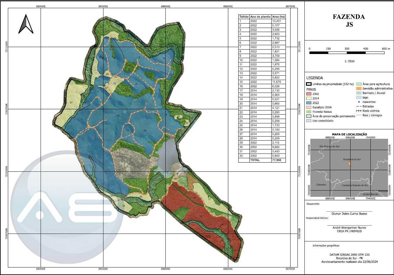 Madeira de Pinus Incluída: O comprador terá à disposição R$ 2 milhões em madeira de pinus, uma área de 77,95 hectares (conforme zoneamento), garantindo um retorno financeiro imediato.
