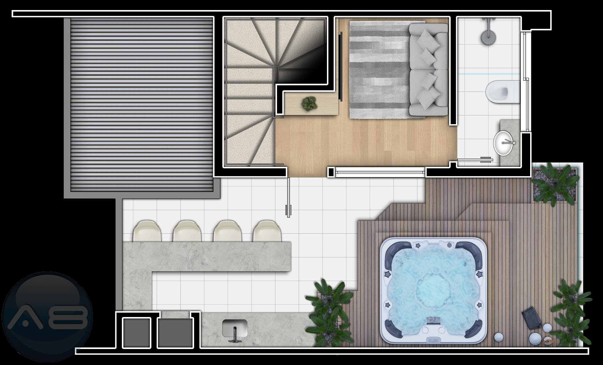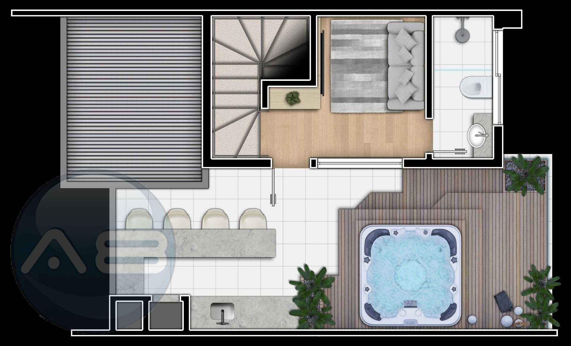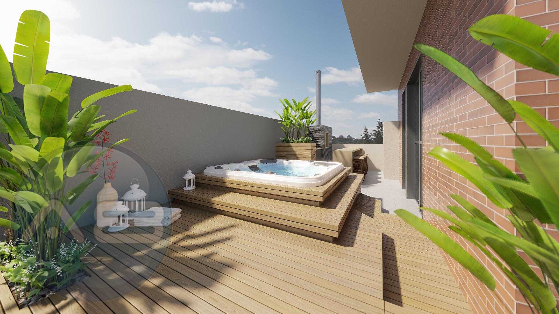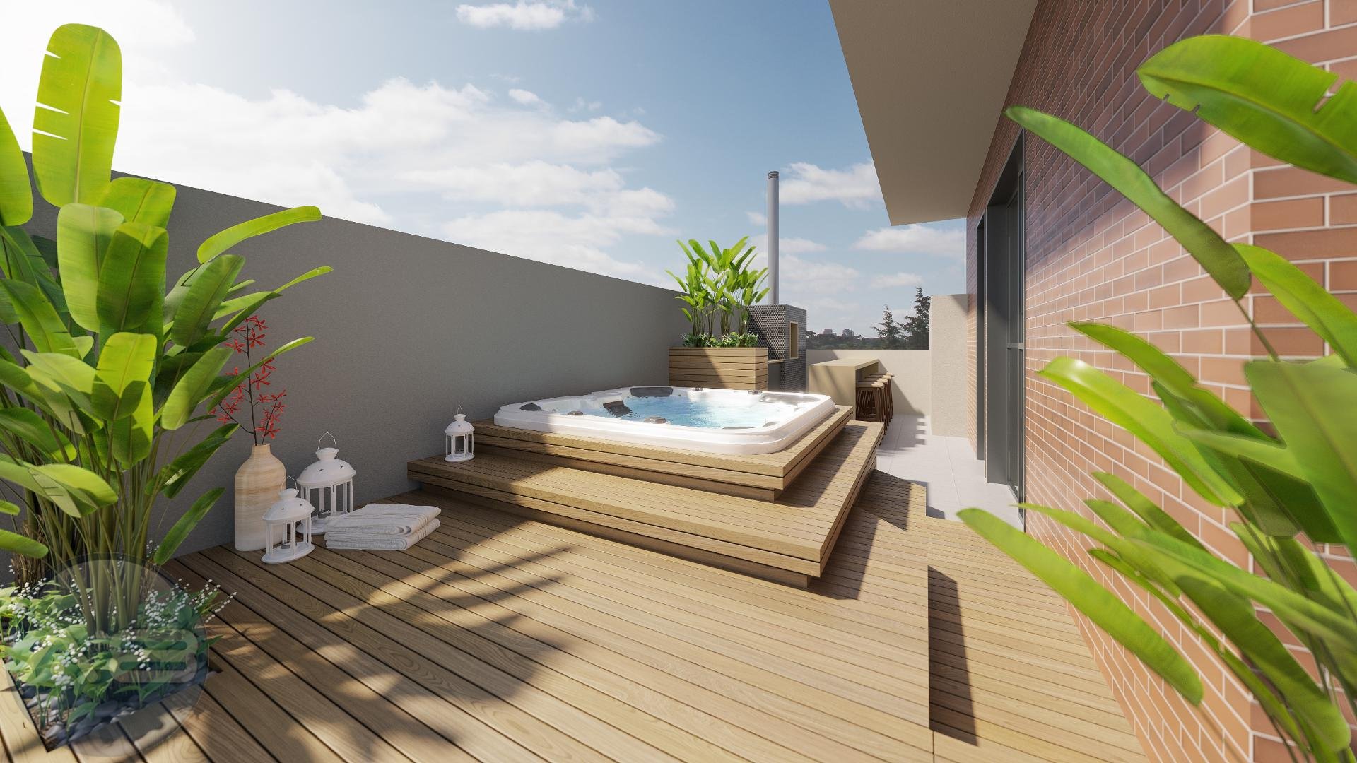Terraço com espaço para home office, estar íntimo ou mais uma suíte com banheiro completo, espaçosa area descoberta com infra para jacuzzi e espaço gourmet.