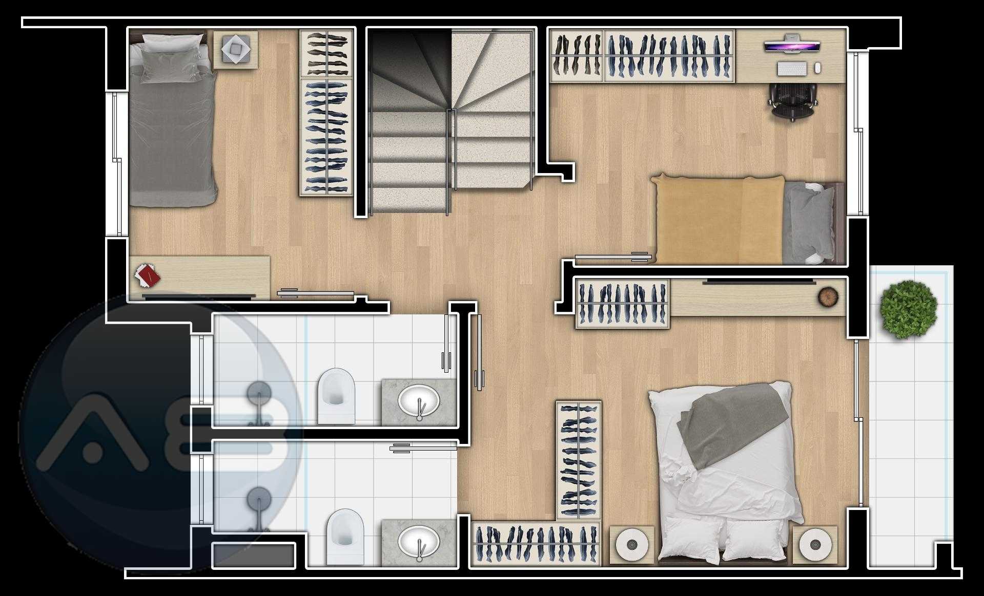 Segundo pavimento com 3 quartos, sendo 1 suíte com closet
