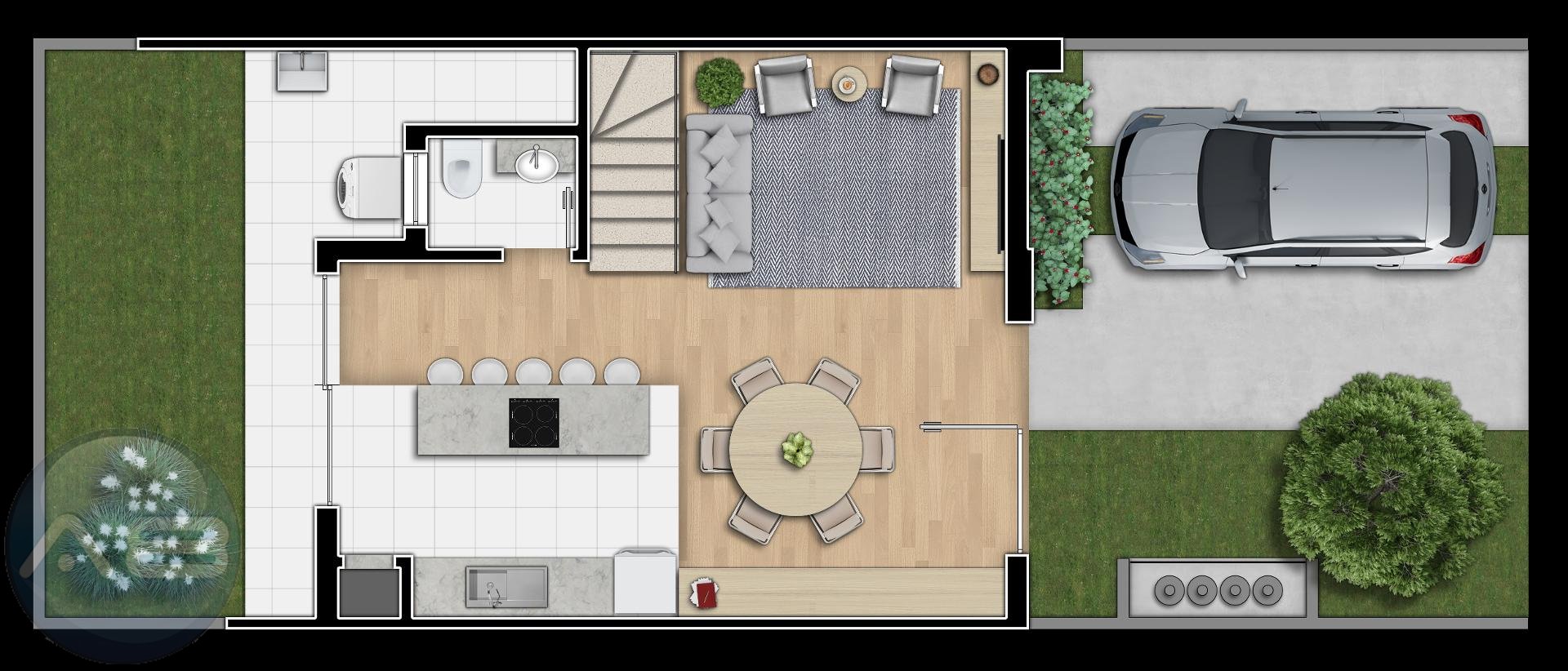 sala estar, jantar integradas com cozinha gourmet; quintal em grama com churrsqueira e lavanderia